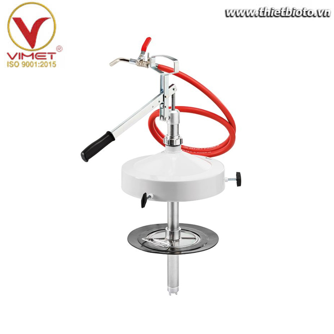 . Bơm được thiết kế với van bi lò xo di chuyển trong ống thép và được bảo vệ với thùng chứa mỡ bên ngoài, tay cầm bằng thép có thể nâng lên hạ xuống.